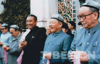 圖為習(xí)仲勛(右二)與烏蘭夫(右一)、十世班禪(右三)、賽福鼎?艾則孜(右四)、楊靜仁(右五)在北京民族文化宮。圖片來源:《中國(guó)西藏》雜志