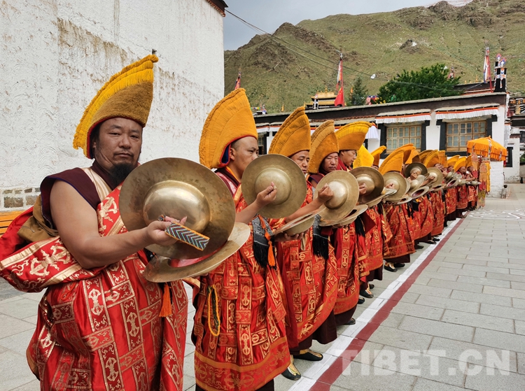 班禪抵達,現場桑煙繚繞,法號聲悠長,扎什倫布寺僧眾以藏傳佛教最高禮儀迎接班禪?,F場等候班禪的信教群眾紛紛摘帽行禮或雙手合十,向班禪的到來表示熱烈歡迎,班禪見狀揮手致意、送上祝福。隨后,班禪在手持黃傘、香爐的高僧引領下緩緩步行至措欽大殿。