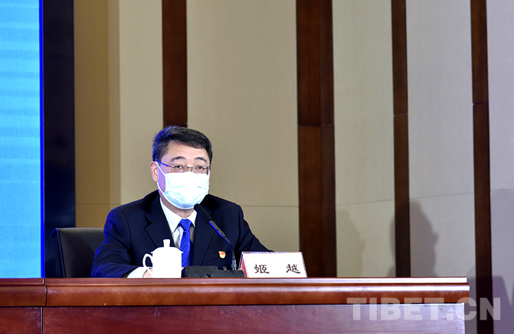 圖為西藏自治區(qū)新型冠狀病毒肺炎疫情防控工作第三場(chǎng)新聞發(fā)布會(huì)上,西藏自治區(qū)旅游發(fā)展廳黨組成員、副廳長(zhǎng)姬越介紹游客服務(wù)保障方面工作 攝影:王媛媛
