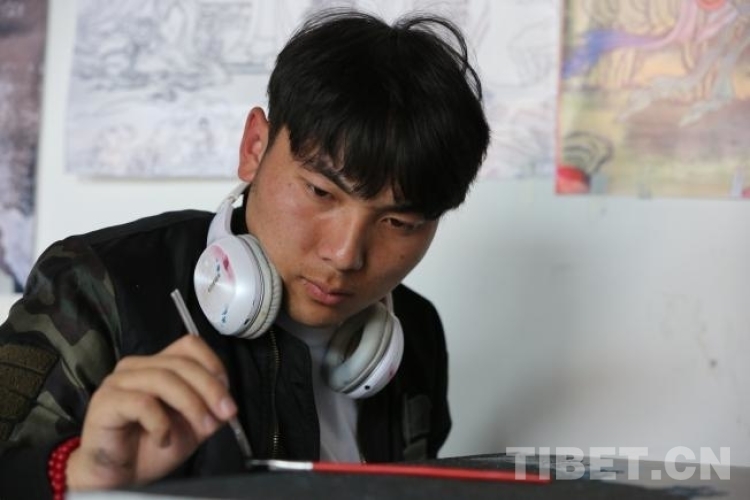 同期學(xué)員中,同樣來自唐卡世家的白瑪旺青,肩負家族厚望,被父親委派而來。2019年,白瑪旺青的父親學(xué)到半途,家中突然接到《格薩爾王與三十大將》的唐卡長卷訂單,不得不退學(xué)回到江達縣家中主持繪制工程。這次,他把兒子白瑪旺青、學(xué)徒桑培和尼瑪布派來學(xué)習(xí),自己帶著46個學(xué)徒繼續(xù)完成訂制唐卡的繪制。“父親對唐卡漆畫很支持,要求我們認真學(xué),學(xué)成后再傳授給他本人和更多的學(xué)徒,”白瑪旺青說,“我和父親覺得,創(chuàng)作漆畫比傳統(tǒng)唐卡快,也會贏得新的市場,能帶動更多學(xué)徒增收。”