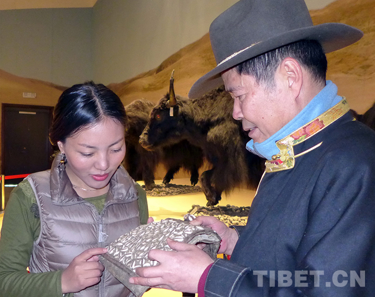 這是吳雨初在向負責展品管理的藏族女兒桑旦拉卓介紹牦牛皮挎包的制作方法(唐召明提供,2015年3月27日攝)