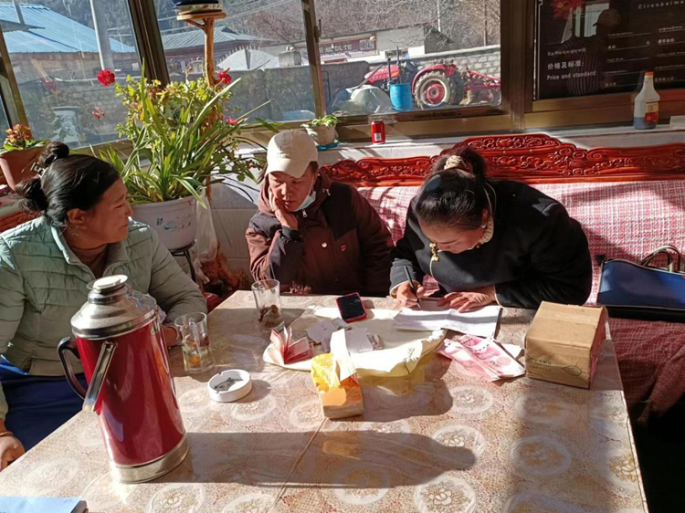 圖為亞夏(右一)協(xié)助村醫(yī)挨家挨戶收取村民醫(yī)保費(fèi)用