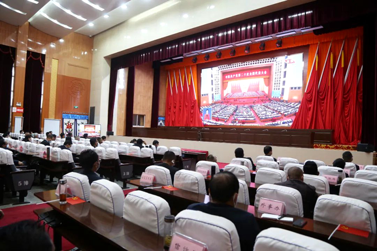 圖為山南市委禮堂內(nèi)干部群眾集中收聽(tīng)收看黨的二十大開(kāi)幕盛況。