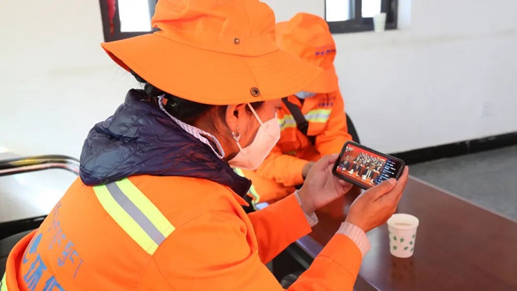 圖為山南市環(huán)衛(wèi)工人在收聽(tīng)收看黨的二十大開(kāi)幕盛況。