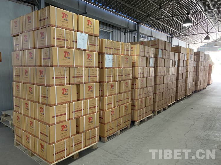 圖為2021年,出席西藏和平解放70周年慶?;顒拥闹醒氪韴F作為禮品之一贈送西藏各寺廟的《中華大典?藏文卷》第一批14種文集201卷經(jīng)精心包裝即將運往西藏