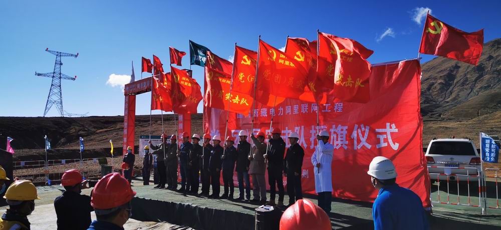 圖為在國(guó)網(wǎng)西藏電力阿里聯(lián)網(wǎng)工程黨、團(tuán)員突擊隊(duì)授旗儀式上,工程建設(shè)者們?cè)谑澜缥菁垢咔嫫鞄?/p>