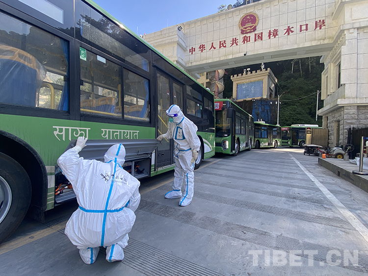 圖為拉薩海關(guān)所屬聶拉木海關(guān)關(guān)員監(jiān)管國(guó)產(chǎn)新能源公交車出口
