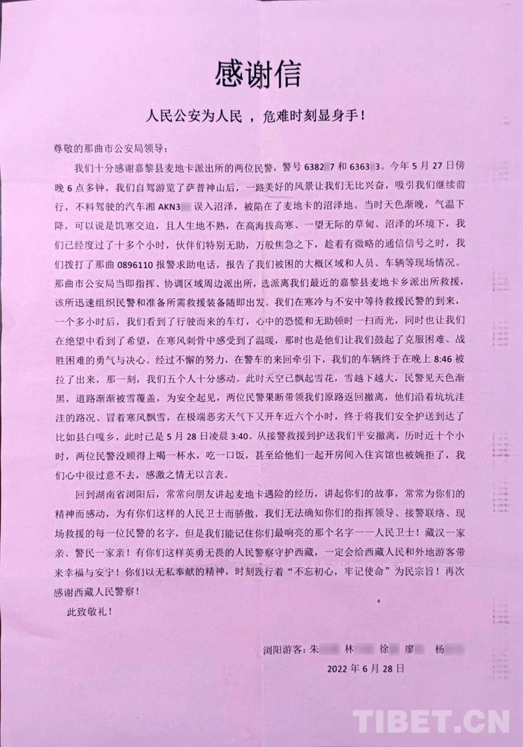 近日,那曲市公安局收到了一份特別的禮物,這是一面印著“人民公安為人民、危難時刻顯身手”的錦旗和一封飽含深情的感謝信。這份特別的禮物是湖南市民朱先生、徐先生寄到西藏的,以此表達對那曲市公安局、那曲市嘉黎縣公安局麥地卡鄉(xiāng)派出所民警的感激之情。