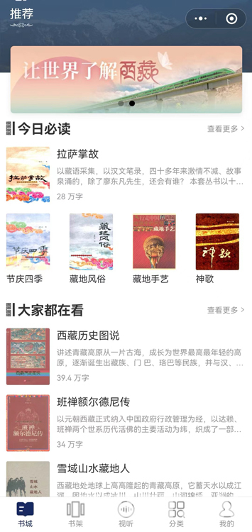 “掌讀西藏”為讀書公益類平臺,免費向讀者提供中國西藏主題的電子圖書。目前有《古格王國》《神歌》《達賴喇嘛轉(zhuǎn)世制度》《班禪額爾德尼傳》《拉薩掌故》《雪域山水藏地人》《節(jié)慶四季》《西藏歷史圖說》《進軍西藏日記》等29本電子圖書。這些電子圖書都是作者寶貴的知識結(jié)晶,也是對中國西藏珍貴的歷史記憶,濃縮了幾代人見證中國西藏發(fā)展的時代烙印。