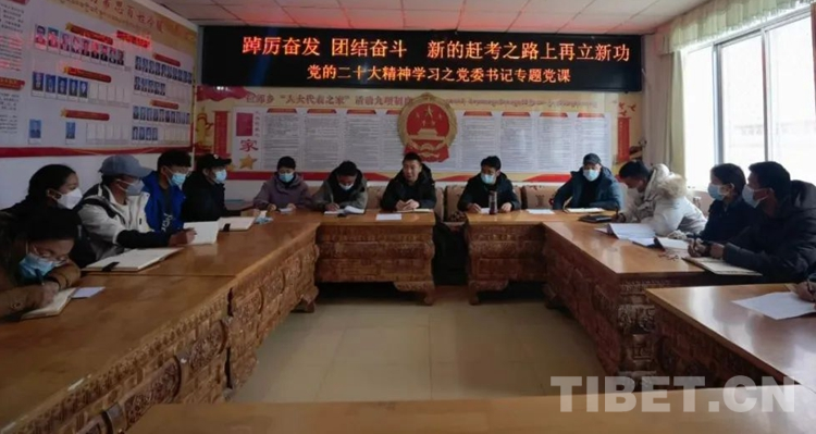 圖為洛扎縣拉郊鄉(xiāng)開(kāi)展題為“踔厲奮發(fā)團(tuán)結(jié)奮斗,新的趕考之路上再立新功”的黨的二十大精神學(xué)習(xí)之黨委書(shū)記講黨課活動(dòng)。