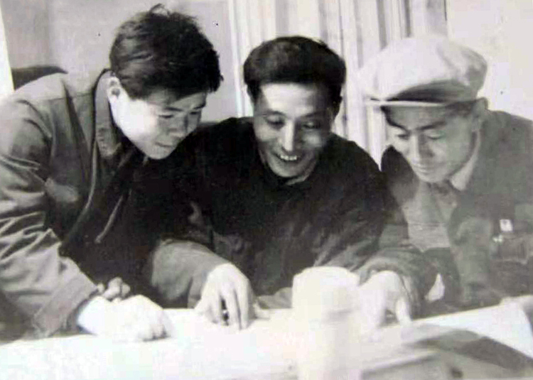 這是李業(yè)壯(左)在那曲地區(qū)農(nóng)機(jī)廠工作時(shí),與藏族副廠長(zhǎng)典地(中)、藏族技術(shù)員覺(jué)吉(右)一同研究開發(fā)新產(chǎn)品 (唐召明提供,1978年攝)