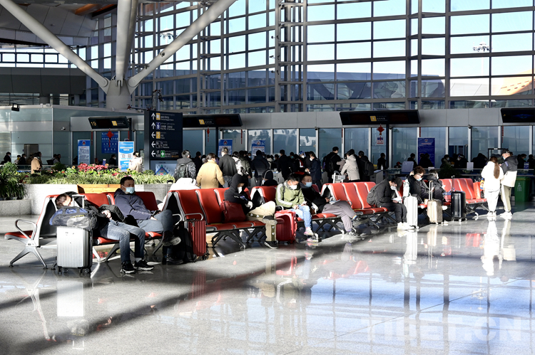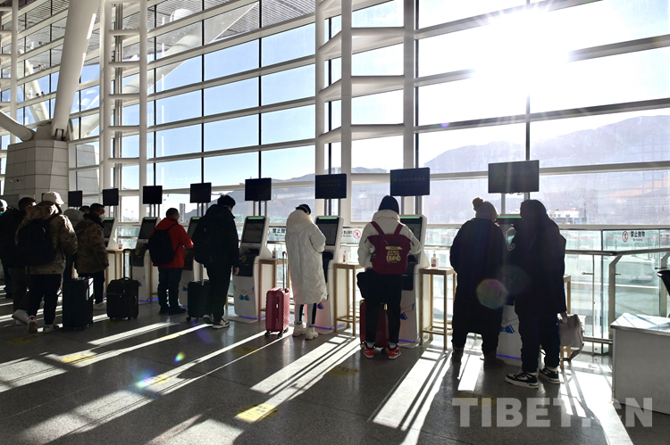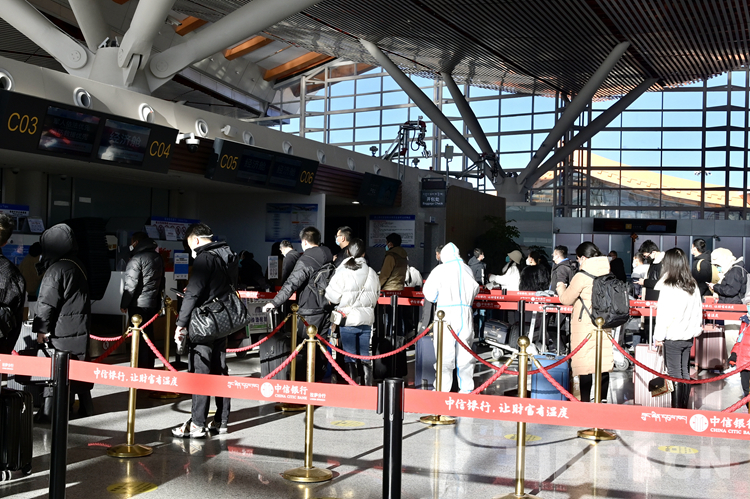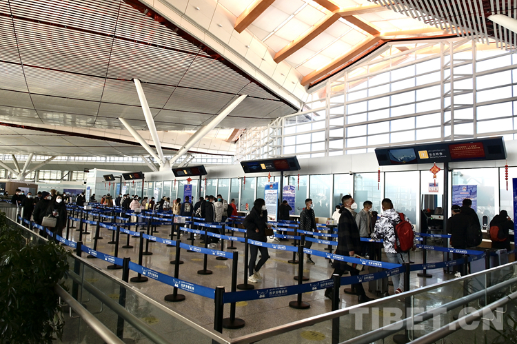 圖為春運(yùn)首日拉薩貢嘎機(jī)場(chǎng)內(nèi)候機(jī)的旅客