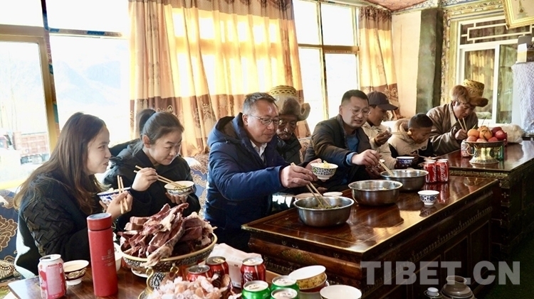 “這些干部和我們相處了這么長時間,都成自家人了。他們家在內(nèi)地,但因為工作必須堅守崗位。我們能做的也不多,就是請他們到家中來吃個簡單的團圓飯?!?多章說著,老人的女兒央金熱情地端來酥油茶。
