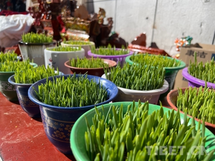 圖為藏歷新年期間,西藏年貨市場(chǎng)里的青稞苗 攝影:德吉卓瑪