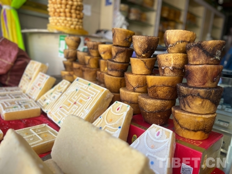 圖為藏歷新年年貨市場(chǎng)里的“退”(奶渣糕)和酥油 攝影:德吉卓瑪