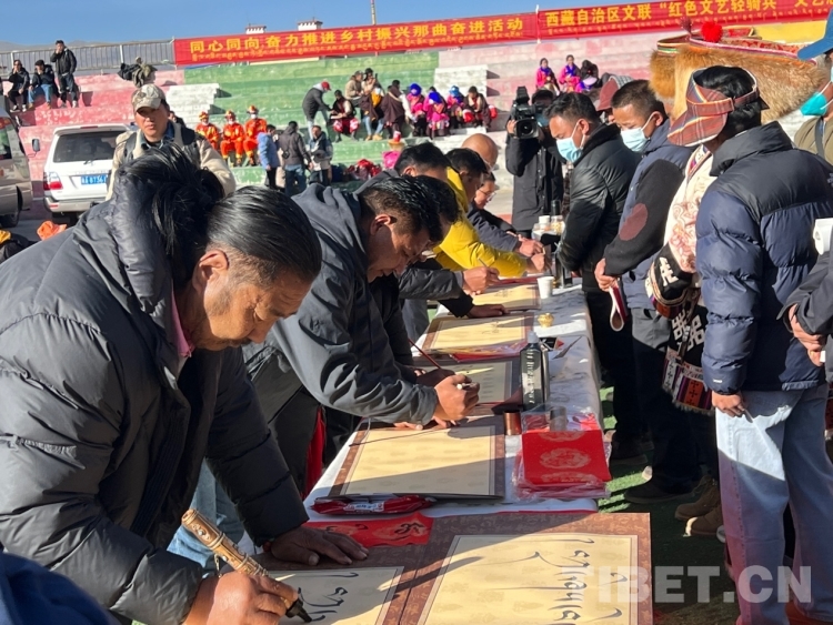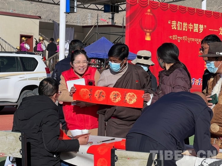 中國(guó)西藏網(wǎng)訊 2月16日,西藏自治區(qū)文聯(lián)主辦的“我們的中國(guó)夢(mèng)”——文化進(jìn)萬(wàn)家活動(dòng)在極高海拔生態(tài)搬遷安置點(diǎn)開展。在送“書法”現(xiàn)場(chǎng),由西藏書法協(xié)會(huì)和山南市11位書法家為當(dāng)?shù)厝罕娝腿?00多張?jiān)⒁饷篮玫男履曜8:腿罕娖谕男履曜T傅??;顒?dòng)現(xiàn)場(chǎng)群眾絡(luò)繹不絕,大家心滿意足地拿著書法家為自己贈(zèng)送的精美“禮品”。一旁書法家們忙碌地為群眾書寫祝詞,另一旁群眾們晾曬著他們得到的書法作品,一時(shí)間現(xiàn)場(chǎng)成了“書法展”,時(shí)不時(shí)地有人前來(lái)參觀欣賞。(中國(guó)西藏網(wǎng) 記者/德吉卓瑪)