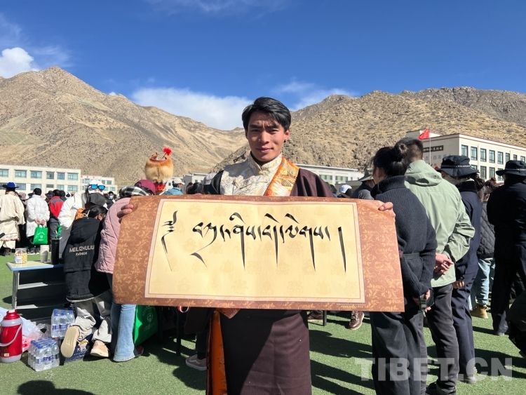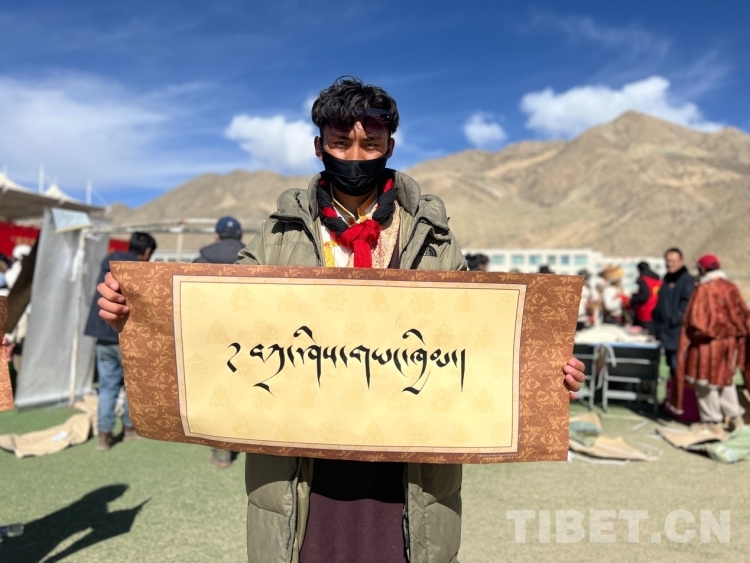 圖為群眾拿到寫有“扎西德勒”字樣的書法作品 攝影:德吉卓瑪
