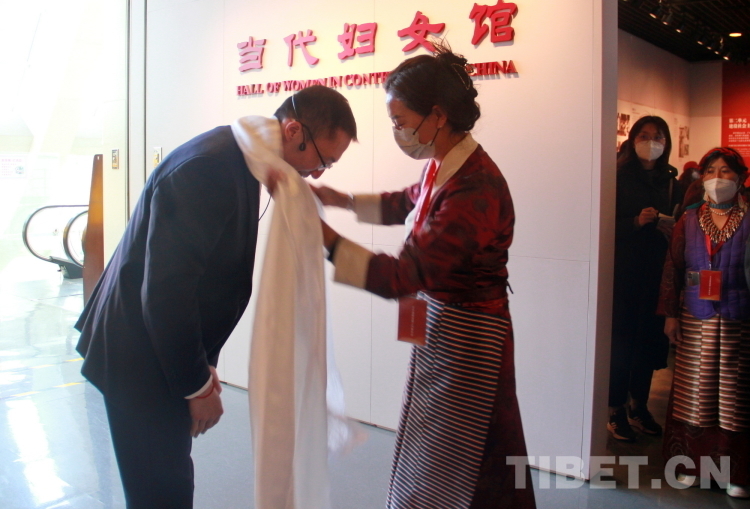 圖為“2023年西藏基層婦聯(lián)干部赴京學(xué)習(xí)參觀團”成員向中國婦女兒童博物館講解員獻上哈達 攝影:劉莉