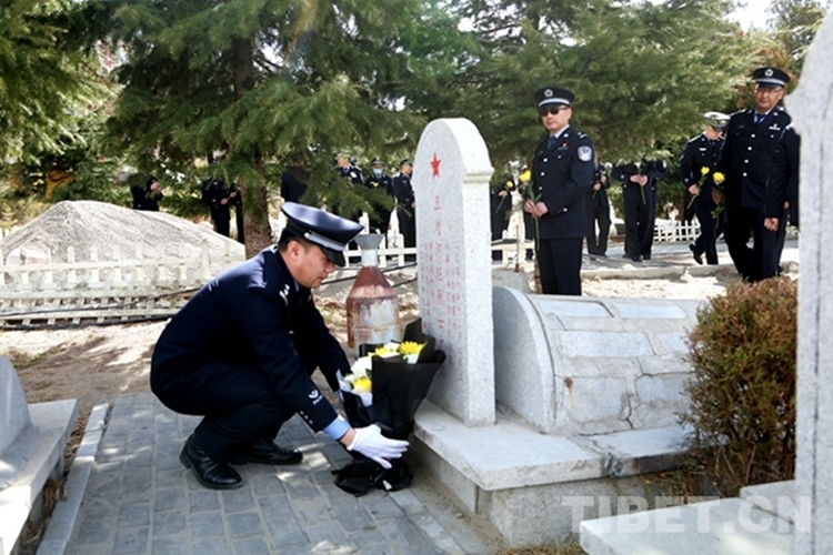 圖為西藏邊檢總站執(zhí)法調(diào)查支隊民警為旦增阿旺烈士擦拭墓碑、敬獻鮮花