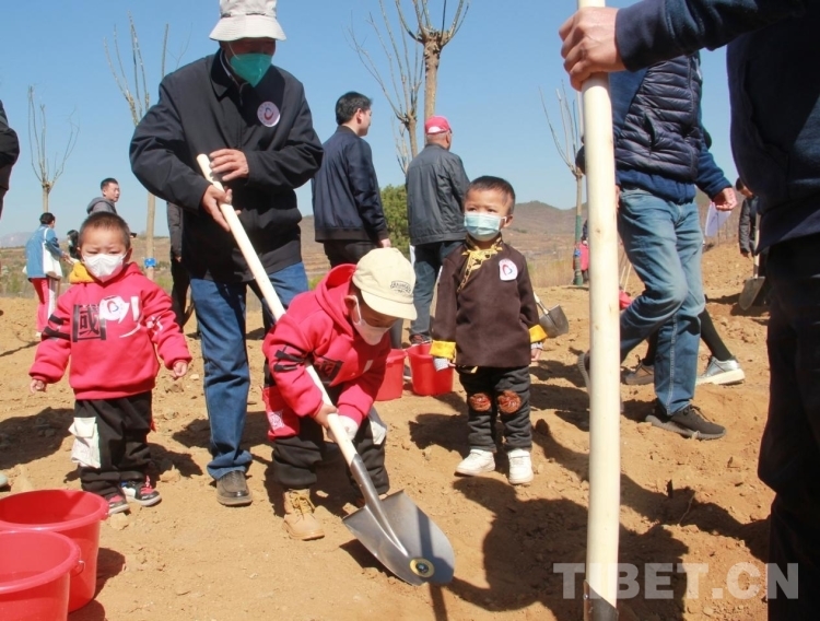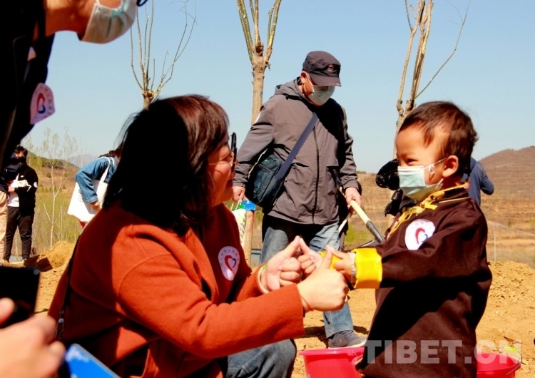 來(lái)自青海省果洛藏族自治州的多杰雖然才3歲多,但在掌握了鐵锨的使用后,他就成了整個(gè)植樹區(qū)域的熱心人,到處幫助別人鏟土,樂(lè)此不疲。圖為多杰正在幫助別人鏟土植樹 攝影:劉莉
