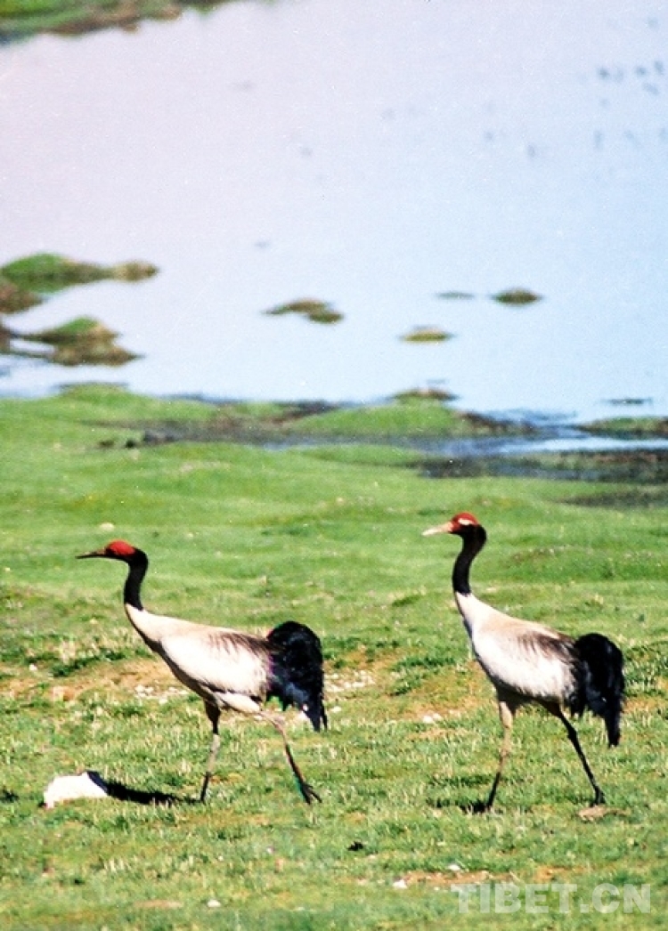 這是兩只漫步在藏北色林錯(cuò)國(guó)家級(jí)自然保護(hù)區(qū)的國(guó)家一級(jí)保護(hù)動(dòng)物、被稱為“鳥(niǎo)類熊貓”的黑頸鶴(唐召明2001年攝)