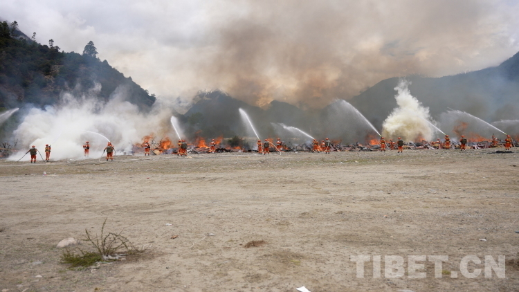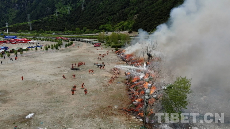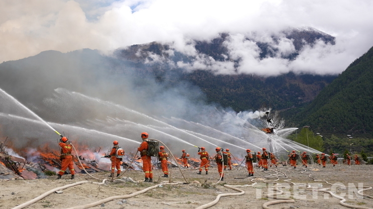 圖為林芝市森林消防支隊救援人員在“應急使命·西藏2023”抗震救災實戰(zhàn)化演習中撲打火線。