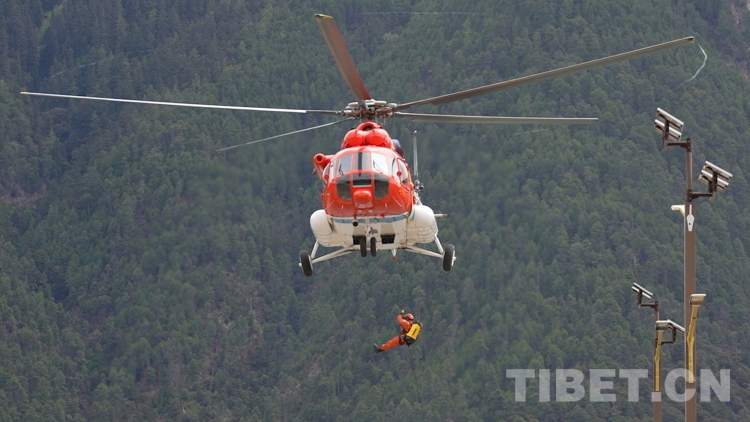 圖為直升機在“應急使命·西藏2023”抗震救災實戰(zhàn)化演習中從空中將林芝市森林消防支隊救援力量投送到位。