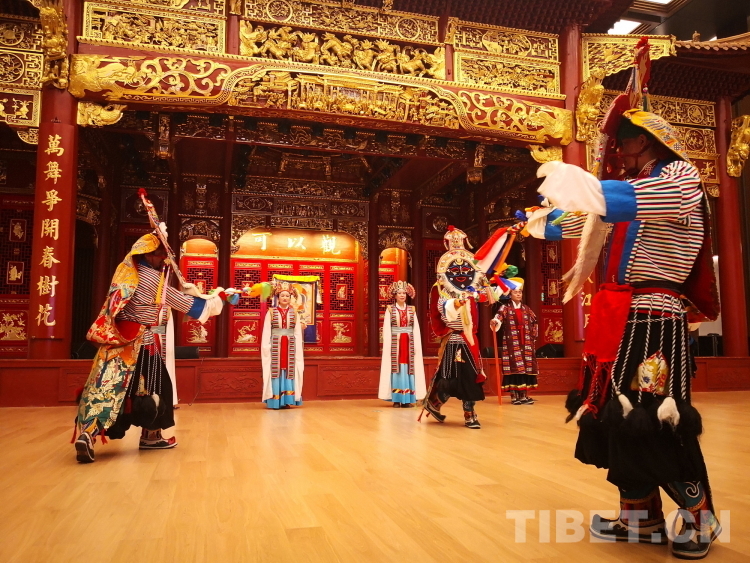 圖為西藏自治區(qū)拉薩市城關(guān)區(qū)娘熱民間藝術(shù)團的藝術(shù)家們在“戲舞雪域——多元文化視野中的藏戲藝術(shù)推廣研討會”上表演藏戲開場《溫巴頓》片段 攝影:劉莉