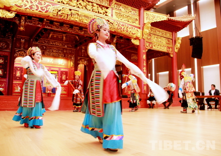 西藏藏劇團副團長米瑪普赤就藏戲的起源、藏戲的特點、藏戲的流派等進行了詳細介紹。伴隨著雄渾響亮的鼓鈸聲,西藏自治區(qū)拉薩市城關(guān)區(qū)娘熱民間藝術(shù)團的藝術(shù)家們表演了藏戲開場《溫巴頓》、藏戲唱腔《朗薩雯波》之貢桑德慶唱腔、拉薩囊瑪《吉白尼瑪》、嘎爾《郎卓》等經(jīng)典片段。精美的服飾、鏗鏘的唱腔、緊湊的故事情節(jié)……贏得了與會嘉賓的連連贊嘆與陣陣掌聲。