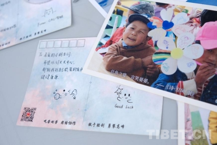 參與活動的同學(xué)們在峰云社人文科考隊準(zhǔn)備的明信片上寫下對當(dāng)?shù)匦∨笥衙篮玫淖8?。一張張寫著滿滿關(guān)切話語、畫著生動可愛圖案的明信片上,飽含著中國農(nóng)業(yè)大學(xué)師生對雪域高原孩子們滿滿的愛意。