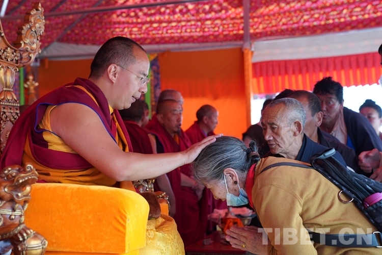 年逾七旬的洛桑巴姆得到班禪摸頂后倍感殊勝,激動(dòng)地落下了眼淚?!澳馨菀娀罘鹛貏e開心,得到活佛的摸頂賜福是我的福分?!甭迳0湍凡粩嗷仡^面向班禪躬身祈禱,久久不愿離去。