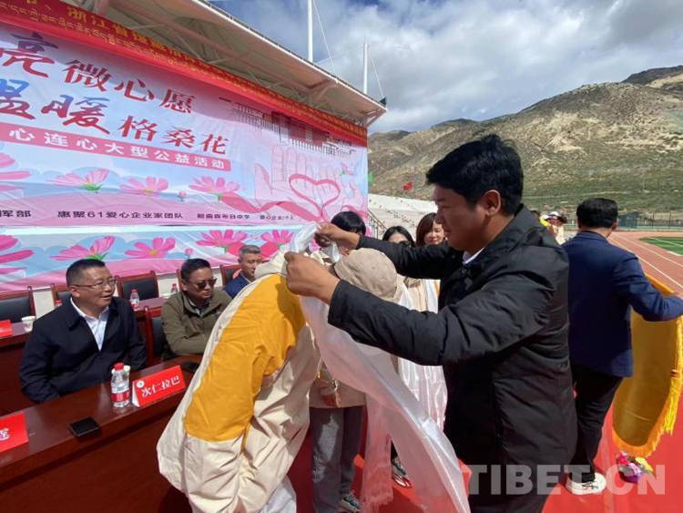中國(guó)西藏網(wǎng)訊 6月19日,浙江金華市惠聚61愛(ài)心企業(yè)家團(tuán)隊(duì)萬(wàn)里送愛(ài)心,在西藏森布日中學(xué)舉行“點(diǎn)亮微心愿·溫暖格?;ā惫婊顒?dòng)。