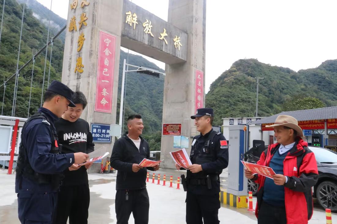 圖為背崩邊境派出所解放大橋執(zhí)勤點(diǎn)民警為過往群眾講解邊境條例相關(guān)知識(shí) 攝影:呂恒剛