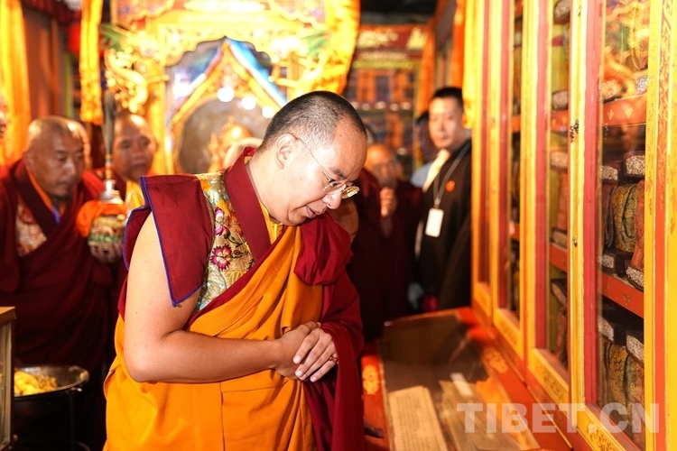 上午9時(shí),在僧眾的期盼中,班禪抵達(dá)哲蚌寺。頓時(shí),鑼鼓喧天,法螺、法號(hào)齊鳴。在手持香爐的高僧以及吹嗩吶的僧人引路,手持黃傘的高僧護(hù)送下,班禪緩步走進(jìn)措欽大殿,逐一朝拜寺內(nèi)各殿堂,并向主供佛像敬獻(xiàn)哈達(dá)。期間,班禪還前往甘珠爾拉康參訪,這里藏有多部《甘珠爾》大藏經(jīng)。
