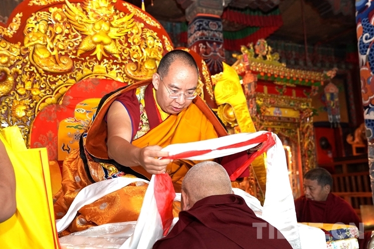 班禪傳授經(jīng)文時(shí),僧眾無不虔誠(chéng)俯首聆聽,他深厚的佛學(xué)造詣和卓越的宗教修為讓寺廟僧眾發(fā)自內(nèi)心地頂禮膜拜。講經(jīng)結(jié)束后,阿旺群增和僧眾手捧潔白的哈達(dá)排起長(zhǎng)隊(duì),井然有序地依次到法座前接受班禪摸頂賜福。每當(dāng)年邁的僧人來到法座前,班禪都會(huì)親切地詢問年齡、身體狀況等,并祝愿他們健康長(zhǎng)壽。