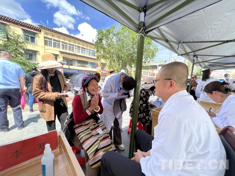 “從首都老遠跑來給我們看病送藥,嘎真切(感謝)、故次仁(愿您長壽)?!毕虬颓谠诠强屏x診點給來自北京海淀區(qū)花園路社區(qū)衛(wèi)生服務中心主任李寒看完膝蓋、胳膊、肩膀等關節(jié)病后一會兒雙手合十、一會兒舉起大拇指、一會兒又跟李醫(yī)生握手表達著心中的感謝之情。