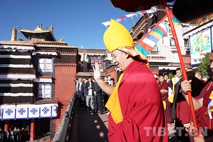 在朝拜過程中,班禪數(shù)度憑欄駐足,向信眾、游客揮手致意,并兩次為信教群眾摸頂賜福。