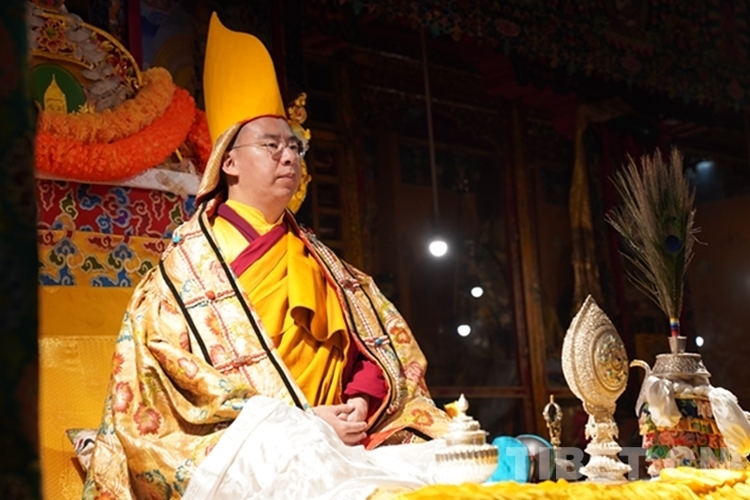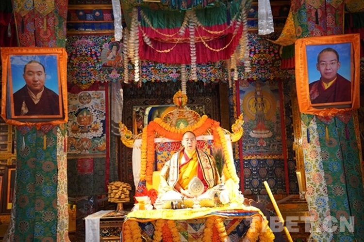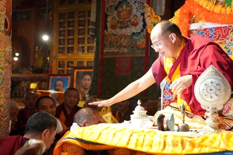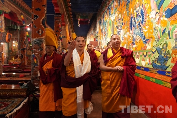 當(dāng)日12時(shí)許,班禪一行抵達(dá)日吾其鄉(xiāng),班禪笑容慈和地一一為等候在寺廟前的信教群眾摸頂,并向表演迥巴藏戲的信教群眾揮手致意。隨后,手持香爐的高僧和吹嗩吶的僧人引路,在手持黃傘的高僧護(hù)送下,班禪緩步進(jìn)入主殿,朝拜大威德金剛拉康,參觀石刻、擦擦文物陳列室后登上大殿寶座,向寺廟僧眾傳授《勝道啟門頌》,為僧眾摸頂。