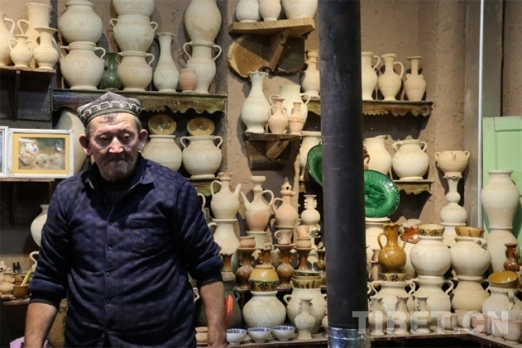 深入高臺民居的內(nèi)部,就可以找尋到現(xiàn)存的土陶人家。步入這個安靜的小院,各式各樣的土陶制品立馬映入眼簾。土陶人家的店主吐爾遜·肉斯塔木是國家級非物質(zhì)文化“模制法土陶燒制技藝”的第七代傳承人,他從17歲開始獨立工作,如今68歲的他依舊挽起袖管,非常投入地沉浸在土陶工藝的創(chuàng)作世界里。