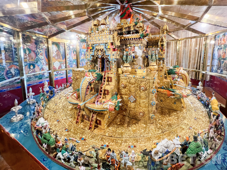 壇城,被稱作“曼荼羅”,是藏傳佛教密宗的重要元素,承載了豐富的象征意義和深刻的修行內(nèi)涵,在藏傳佛教繪畫、寺院建筑、佛塔建筑、宗教法器、佛事活動(dòng)中被廣泛采用,并形成了固定的模式和種類。 據(jù)扎什倫布寺僧人扎平介紹, “壇城從整體上來講有二維壇城、三維壇城之分,但按其造型形式,表現(xiàn)內(nèi)容和使用材料可分為平面繪畫壇城、立體建筑壇城、彩砂彩粉浮雕壇城等多種類型。我們現(xiàn)在所看到的時(shí)輪壇城既是代表人體也是代表宇宙,它的每一個(gè)組成部分都與人體有著對(duì)應(yīng)關(guān)系。它是用金、銀、銅、木頭等制成的立體法器壇城模型,就像立體的宮殿,這類壇城是作為密宗冥想法器,供陳列和膜拜使用。除此之外,還有金剛密法、喜經(jīng)剛兩座造型各異的壇城。殿堂頂部的壇城壁畫都是僧人以近乎于90度的立體筆觸繪制出來的,其難度可見一斑?!?nbsp;