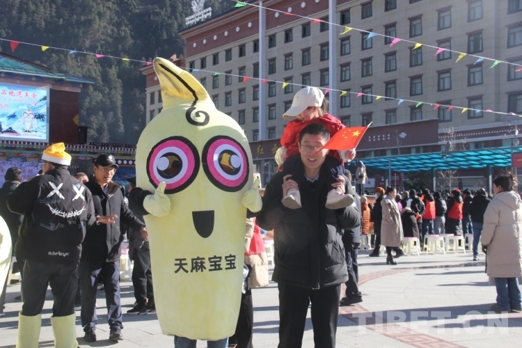 圖為開幕式現(xiàn)場觀眾與天麻寶寶合影 攝影:旦曲