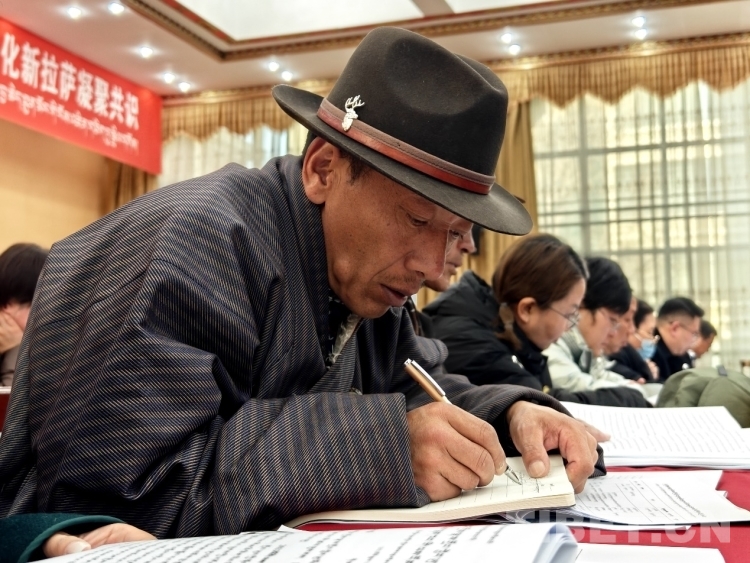 圖為開(kāi)幕會(huì)現(xiàn)場(chǎng)政協(xié)委員認(rèn)真做著筆記 攝影:次旦拉姆
