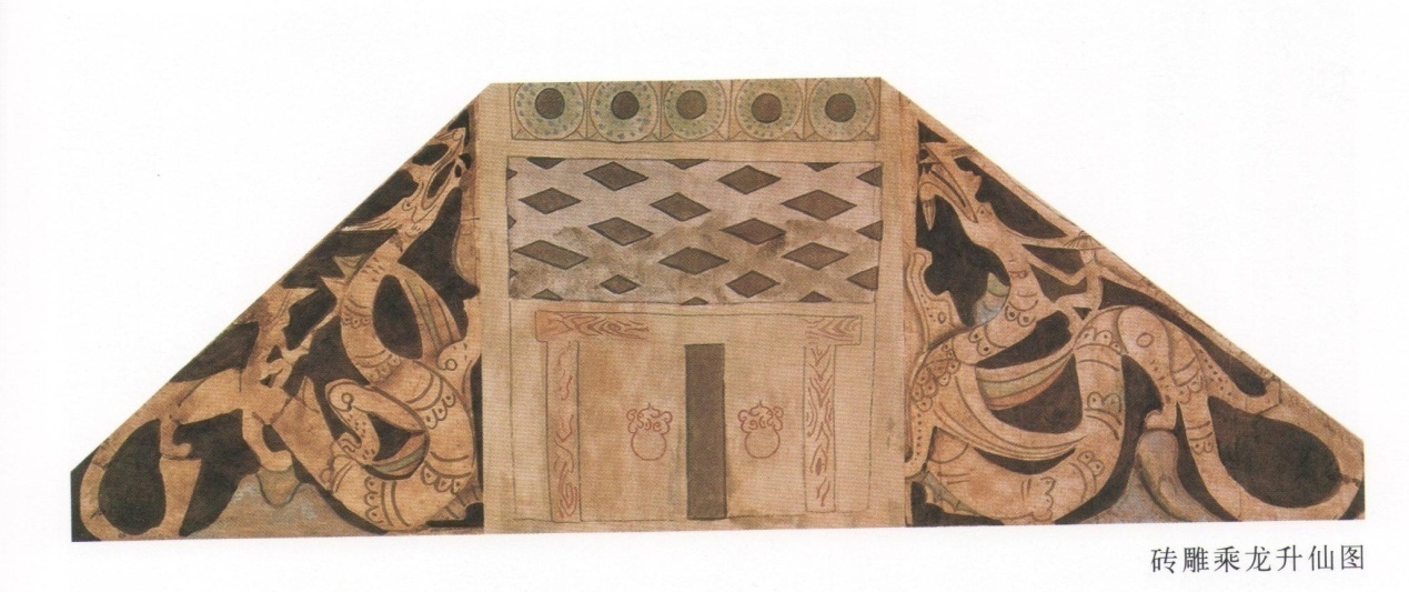 圖為洛陽(yáng)燒溝61號(hào)西漢墓磚雕造型:神人乘龍升仙圖。門上的五個(gè)玉璧代表天國(guó)之門。