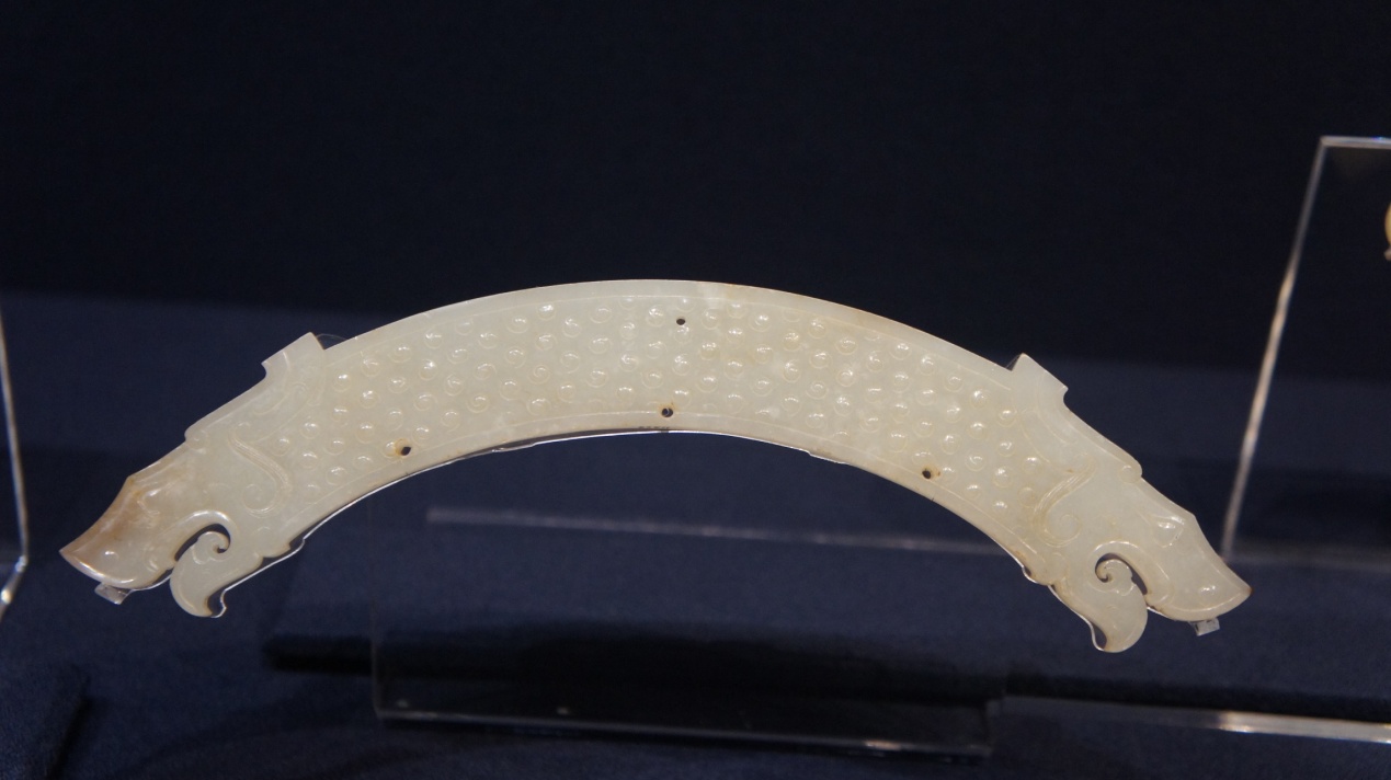 圖為湖北荊州出土楚國(guó)玉佩:二龍拱璧,載人升天,攝于荊州博物館,距今2400年