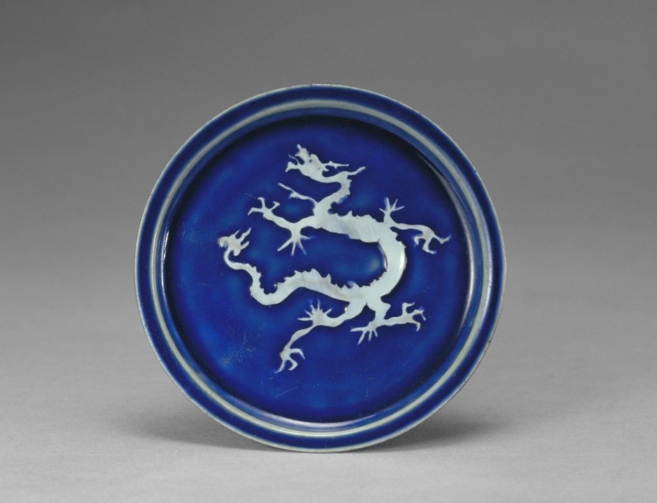 藍(lán)釉白龍紋折沿盤(pán),高1.1厘米,口徑16厘米,足徑14厘米。盤(pán)折沿,淺壁,平底。盤(pán)內(nèi)外施藍(lán)釉,釉色純凈明亮,猶如藍(lán)寶石般晶瑩、光彩奪目。內(nèi)底在藍(lán)釉地上以泥料塑貼一條矯健的白龍。龍細(xì)頸,三爪,作昂首翻騰狀。此盤(pán)為元代景德鎮(zhèn)窯燒造,可能是配合酒盞使用的托盤(pán)。