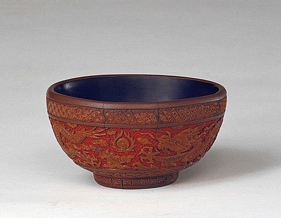 此剔黃云龍紋碗,高6.9厘米,口徑13厘米。碗圓口,內(nèi)髹黑漆,直壁下斂接圈足??谕庋丶案瓜虏拷闾庽埸S漆,雕“卍”字錦、如意云頭紋各一周。腹部以朱漆刻花錦為地,兩條黃色行龍追逐滾動(dòng)的火珠,雙目圓瞪,活力四射,氣韻生動(dòng)。碗足內(nèi)有刀刻填金“大明萬歷己丑年制”楷書款,該漆器的龍紋形象以及細(xì)謹(jǐn)?shù)募y飾為萬歷時(shí)期雕漆的典型風(fēng)格。(中國西藏網(wǎng) 綜合/周晶)