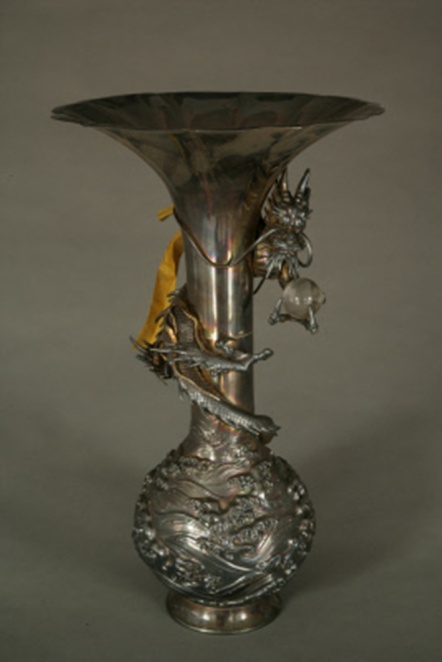 此款銀蟠龍紋花瓶,高39厘米,口徑22厘米,底徑9.5厘米。喇叭形口,長頸,球形腹,底有圈足。瓶身腹部捶鏨裝飾,翻騰的海水中浪花飛濺,一長龍從瓶頸基部躍出波濤,以圓雕形式大海盤旋而上,龍身纏繞瓶頸,龍首貼近喇叭形瓶口下,頭高昂,短粗的龍角豎立,伸出一龍爪擎一晶瑩剔透水晶球一枚。寓“龍戲珠”之意。銀瓶為一對,是宮中的貢品,寓意“雙龍戲珠”。每只花瓶皆附有黃條,其上墨書:“小村壽太郎進”字樣。