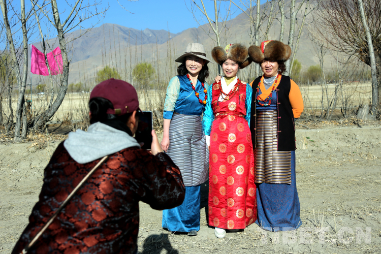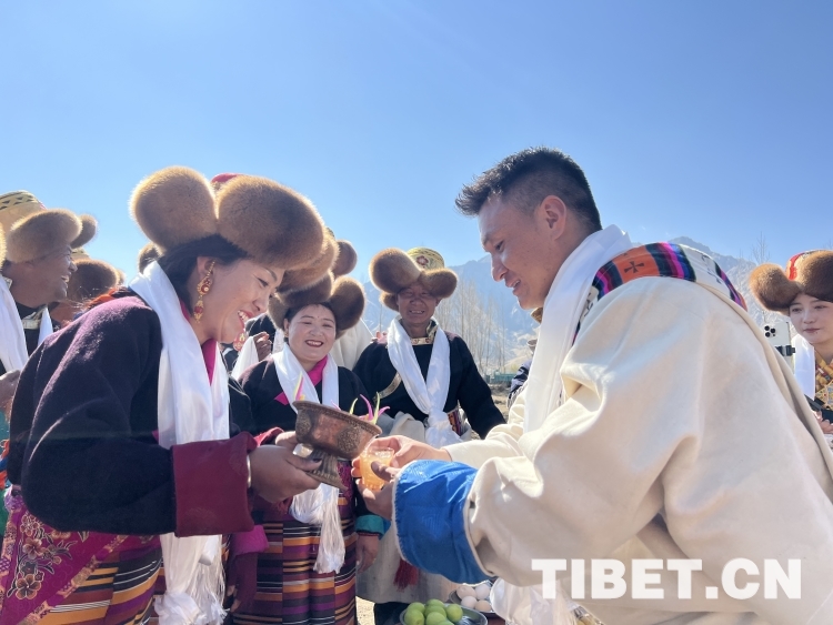 開耕儀式結(jié)束后,茶巴朗村藏戲隊成員們?yōu)樵缫褤Q好藏裝過來體驗西藏民俗文化的游客們獻(xiàn)哈達(dá)、敬青稞酒、唱敬酒歌,游客們現(xiàn)場學(xué)起“三口一杯”與當(dāng)?shù)厝斯捕冗@美好的一天。西藏卓美旅行社負(fù)責(zé)人孫赫男介紹說:“西藏除了山水美景之外,春耕儀式也是非常具有當(dāng)?shù)靥厣奈幕枺芙o人留下深刻記憶。今天,我?guī)е鴣碜员鄙蠌V等全國各地的游客來這里體驗春耕儀式,讓大家看看西藏當(dāng)?shù)氐娜罕娛窃鯓娱_始春天的。游客們穿著藏裝,免費品嘗青稞酒、酥油茶、牛肉、藏雞蛋等各種農(nóng)產(chǎn)品,還和充滿熱情的當(dāng)?shù)卮迕駛兓?,他們玩得非常開心?!?nbsp;