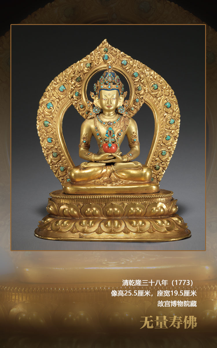 這尊造像與其他五十五尊同樣造型的無量壽佛,一同供奉在紫禁城養(yǎng)性殿西暖閣佛堂的一座八面七層的紫檀木佛塔中。根據(jù)《六世班禪洛桑巴丹益希傳》、內(nèi)務(wù)府造辦處《活計檔》及軍機處滿文檔案的記載,乾隆帝在乾隆三十五年(1770)寧壽宮區(qū)域營建開始前,即乾隆三十三年(1768)向六世班禪訂做了這五十六尊無量壽佛,佛像圖樣、鑲嵌寶石等材料均為宮廷提供。這些造像于乾隆三十八年完成并送回宮廷,此后一直供奉于養(yǎng)性殿佛堂至今。乾隆四十五年(1780)六世班禪進京朝覲,還曾親自瞻仰過此塔此像。故這組無量壽佛,是乾隆時期宮廷審美與扎什倫布寺造像技術(shù)的高度融合,經(jīng)過乾隆帝本人親自設(shè)計,又有明確的制作時間,是清代宮廷造像及扎什倫布寺造像研究的重要標型器物。