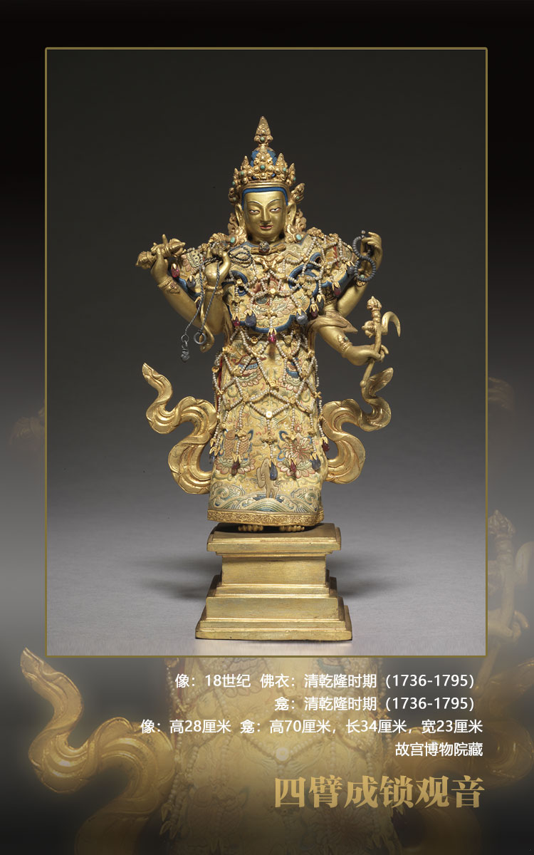 成鎖觀音,即不空羂索觀音。觀音一面四臂,分別持羂索、金剛杵、念珠、金剛鉤,在現(xiàn)在的圖像里很少找到持物相同的造像,可能是特別的傳承。觀音立姿站于方形臺座上。因其所著佛衣未曾打開,故造像身體裝飾情況不清。佛衣為清宮配做,繡工精細,上綴串珠瓔珞,極具宮廷風(fēng)格。另有清宮配做紫檀木重檐亭式玻璃門佛龕,龕背面陰刻四體文題記,漢文為:“乾隆三十七年十二月十二日,欽命阿旺班珠爾胡土克圖認看供奉大利益扎什璃瑪四背成鎖觀世音菩薩。”“四背”即“四臂”的誤書。